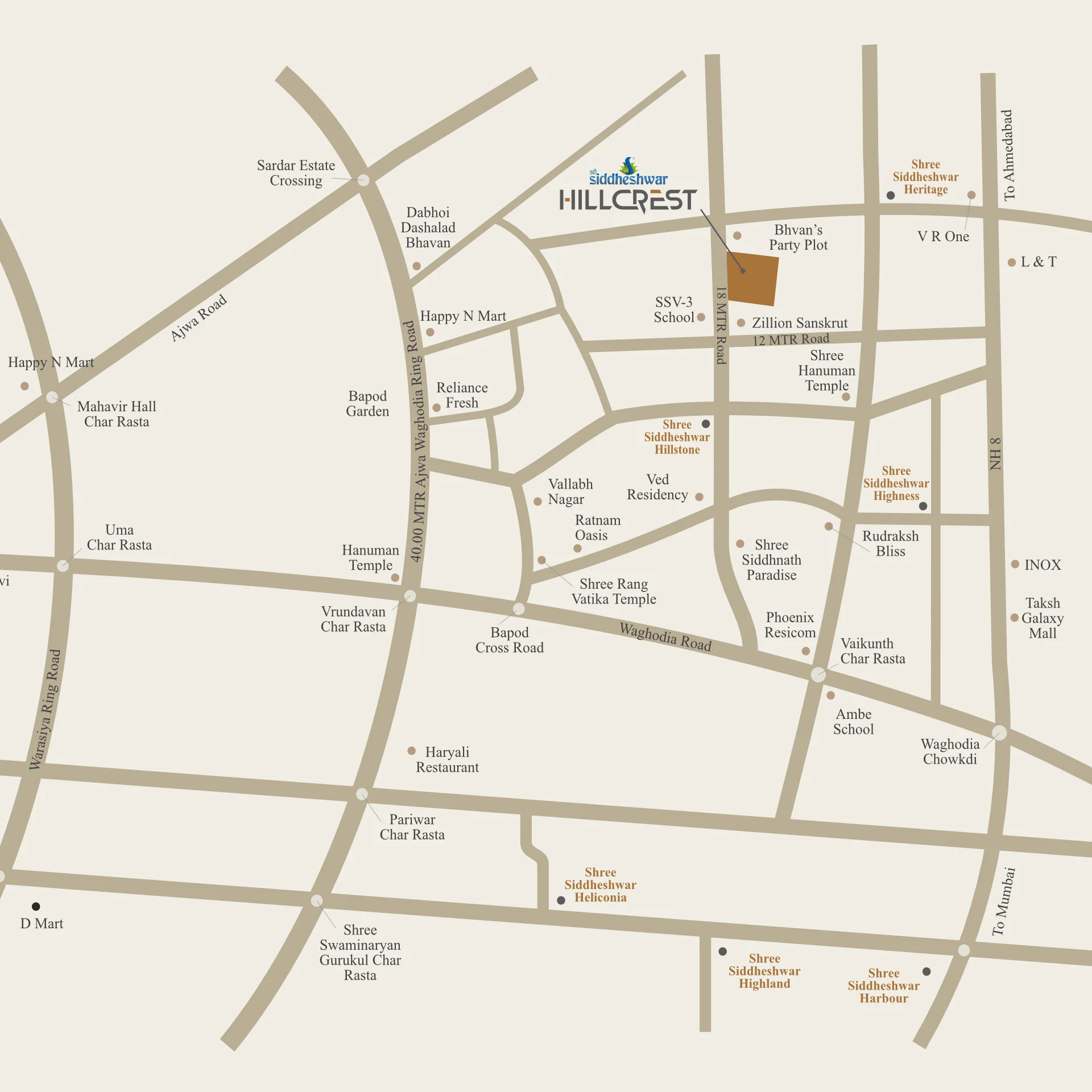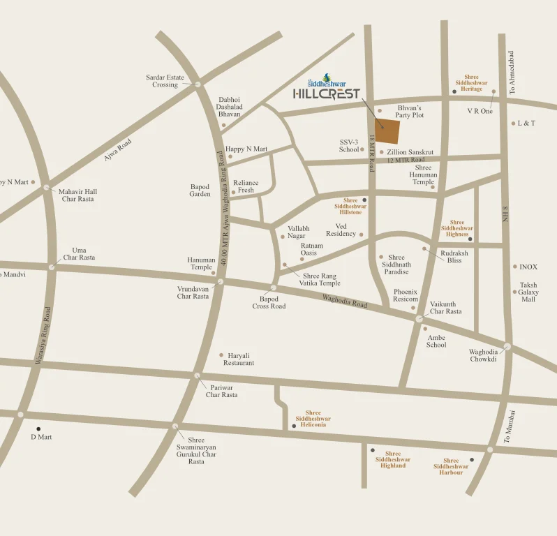 Shree Siddheshwar Hillcrest is around 9 Kms away from Vadodara Railway Station & 6 Kms away from Vadodara Airport. The property enjoys decent connectivity with basic amenities like a petrol pump, hospitals, and schools. For instance, the property is just opposite the SSV 3 school. In the same way, all basic amenities are just around it.
