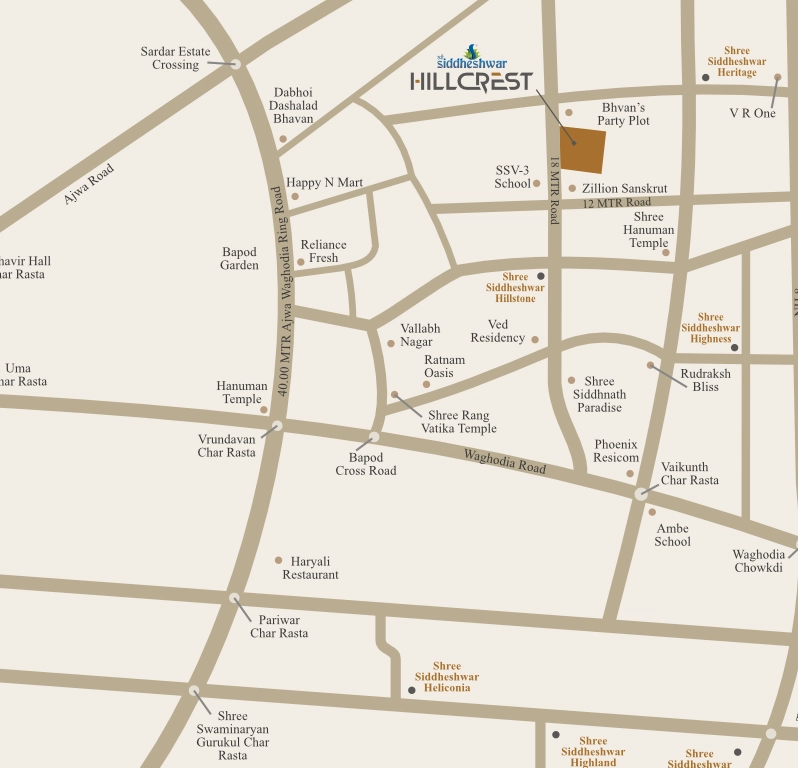 Shree Siddheshwar Hillcrest is around 9 Kms away from Vadodara Railway Station & 6 Kms away from Vadodara Airport. The property enjoys decent connectivity with basic amenities like a petrol pump, hospitals, and schools. For instance, the property is just opposite the SSV 3 school. In the same way, all basic amenities are just around it.